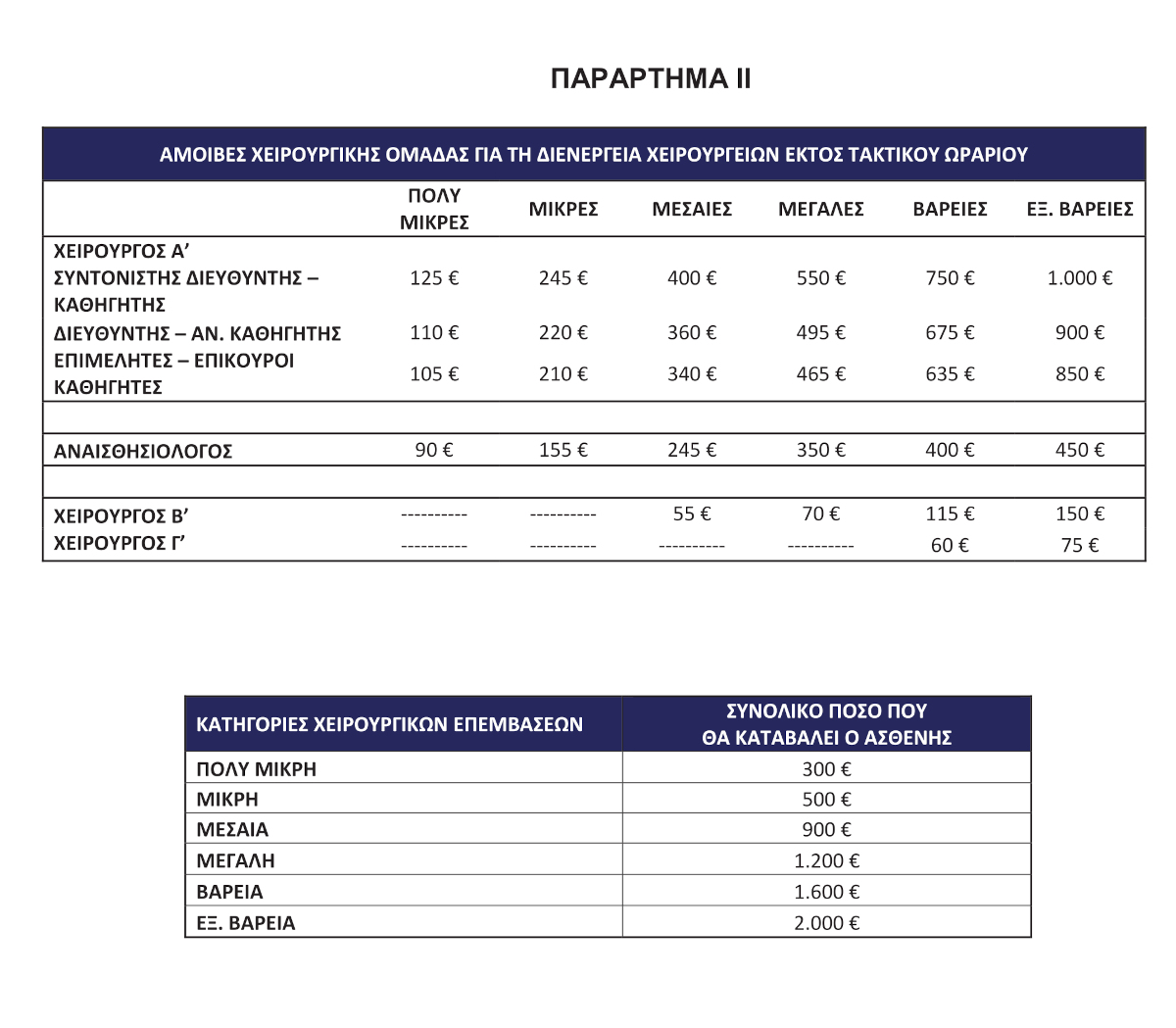 2. Οι αμοιβές του ιατρικού προσωπικού, οι οποίες συμπεριλαμβάνονται στο συνολικό ποσό που θα καταβάλει ο ασθενής στο Νοσοκομείο, καθορίζονται, ανάλογα με την οριζόμενη στο Παράρτημα Ι κατηγορία εκάστης διενεργούμενης χειρουργικής επέμβασης και επεμβατικής πράξης, στο Παράρτημα ΙΙ της παρούσας, το οποίο αποτελεί αναπόσπαστο μέρος αυτής.