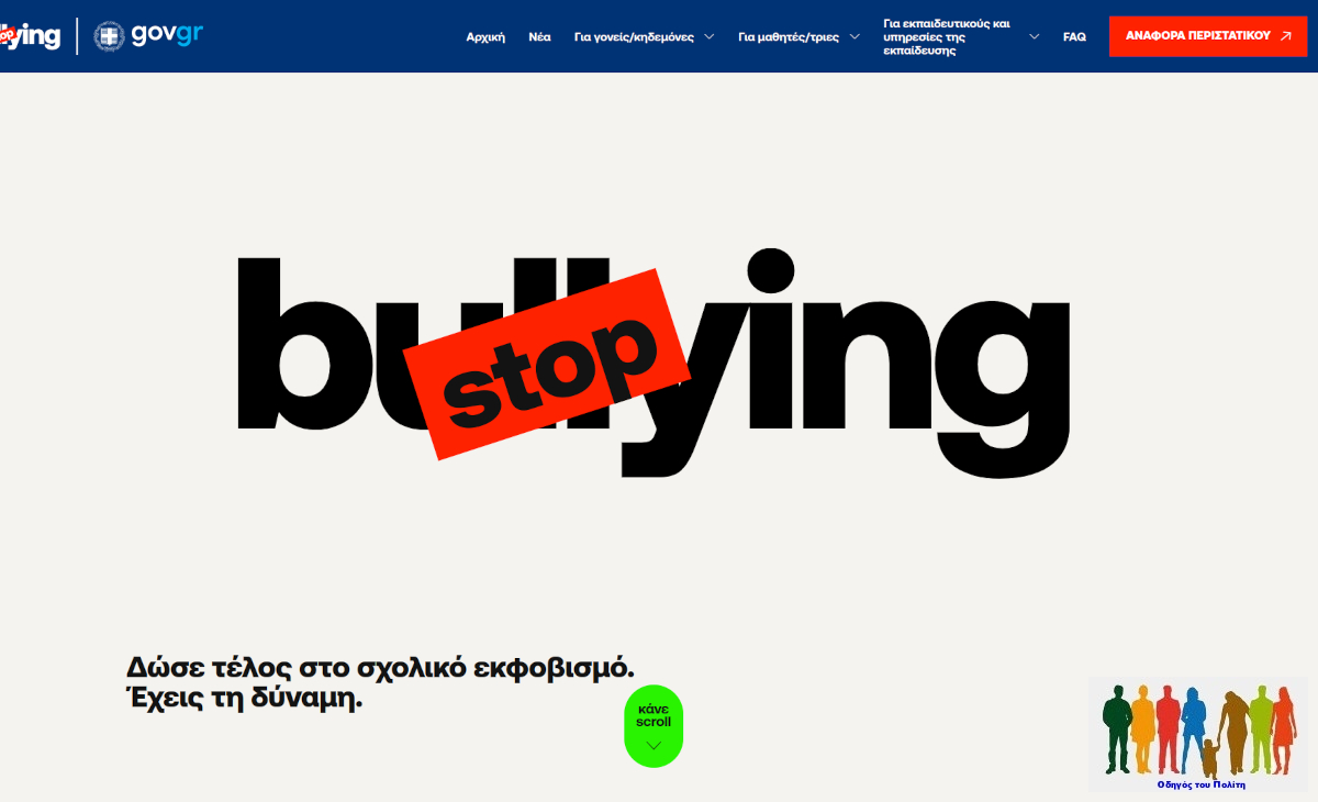 Στην παραπάνω πλατφόρμα, υφίσταται λειτουργικότητα που τιτλοφορείται «αναφορά περιστατικού» για την υποβολή αναφορών περιστατικών ενδοσχολικής βίας και εκφοβισμού.