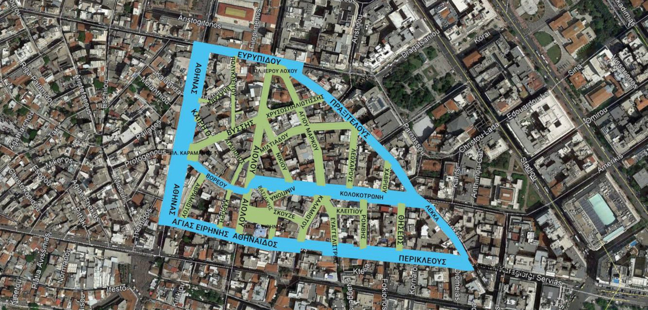 1.1. Αιόλου από Λυκούργου μέχρι Ευπόλιδος, από Σοφοκλέους μέχρι Κολοτρώνη και από Βορέου μέχρι Ερμού.